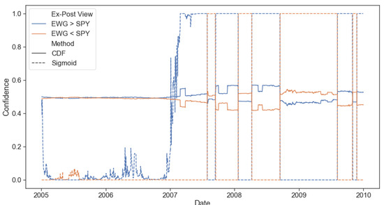 We can now focus our attention on using the newly obtained asset return regime-switching forecasts. As discussed at the beginning of Section 3 and Section 3.2, one of the drawbacks of the BL model remains the static inputs of view confidence. Since our multi-period optimization method requires frequent re-solving, the risk and return estimates need to be updated according to the newly available information. Therefore, we propose converting our regime-switching based forecasts into dynamic confidence levels for investor views.