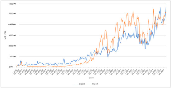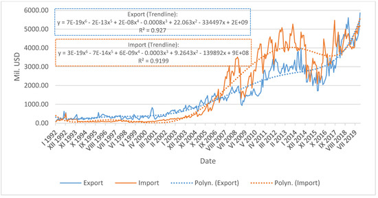 The figure and the data set show the course of the time series at monthly intervals from January 1992 to December 2019. The figure shows the fluctuations within the individual years of the monitored period. However, the question is whether those are regular seasonal fluctuations or random fluctuations caused by imperfect long-term trade relations between Russian and Chinese trade partners. There is a relatively large increase in the volume of Russian goods exported to the PRC. The smallest volume of export, less than USD 93 million, was recorded at the beginning of the course of the time series, that is, in January 1992, while the largest volume of export was in December 2019 (more than USD 5860 million). By contrast, the smallest volume of import was achieved in January 1999 (less than USD 43 million), while the largest volume of goods imported from China to Russia was achieved in August 2017 (more than USD 5472.5 million).