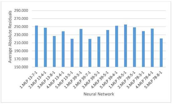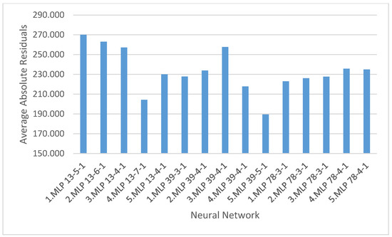 The table shows that the most successful neural network is the 5. MLP 39-5-1, a neural network created with a quarter’s time lag. The average absolute residual is 189.597. The graph in Figure 2 shows the differences between the networks.