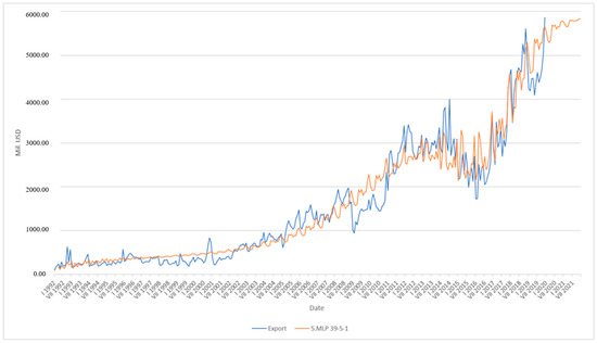 The graph in Figure 4 shows the comparison of the actual course of the export and equalized time series using the 5. MLP 39-5-1 network.