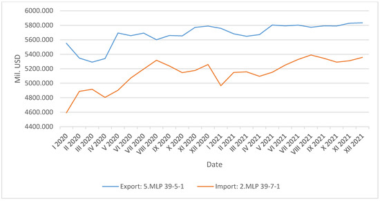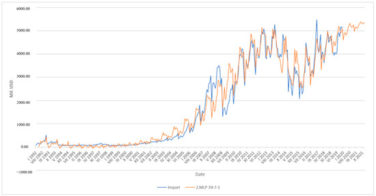 Another step was to compare the import time series with the most successful network in this part of the experiment, specifically the network 2. MLP 39-7-1 (for more details, see Figure 5).
