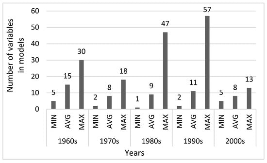 The development and evolution of these discriminant analysis models were also connected with the number of exogenous (diagnostic) variables that were used in these models over the decades. Within this scope, J.L. Bellovary, D.E. Giacomino, and M.D. Akers carried out research into the number and character of the variables used in the models, among other things (). Based on the research findings, Figure 1 presents the number of diagnostic variables used in the bankruptcy prediction models.