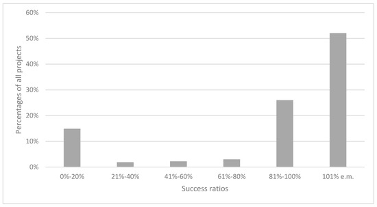 Distribution of success ratios of 269 civic crowdfunding projects, i.e., ratios of realized earnings and target earnings (vertical axis: percentage of all projects; horizontal axis: success ratios of civic crowdfunding projects).