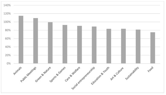 Average success ratios of civic crowdfunding projects, i.e., ratios of realized earnings and target earnings, per project theme (vertical axis: average success ratio per project theme; horizontal axis: project theme).
