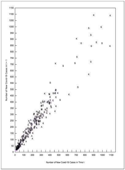 Figure 2 shows that the UK and the USA suffered from the highest levels of new cases of COVID-19 (the upper right hand quadrant of Figure 2 contains only K and S markers indicating the UK and the USA respectfully). It is interesting that the lower right frontier of the data contains observations from South Africa (A), the United Kingdom (K), and the USA (S) and these same countries are also on the upper left hand frontier. Brazil and Europe observations (B and E) are concentrated in the middle of the data through the upper left frontier. This spread of a given country’s observations between the upper left and lower right frontiers implies that omitted variables within a given country are affecting where observations lie, instead of differences in the situation between countries. A fixed effects regression model would be inappropriate in this situation. The equation underlying the RTPLS process used in this paper was Equation (4) where Y = the number of new cases in t + 1, X = the number of new cases in t, and q is the combined effect of all omitted variables. The omitted variables within a country would include the spread of mutant variants of the virus and where it was spreading, the percent of the population vaccinated and who was vaccinated, changes in climate, changes in the enforcement and adherence to social distancing rules, etc.