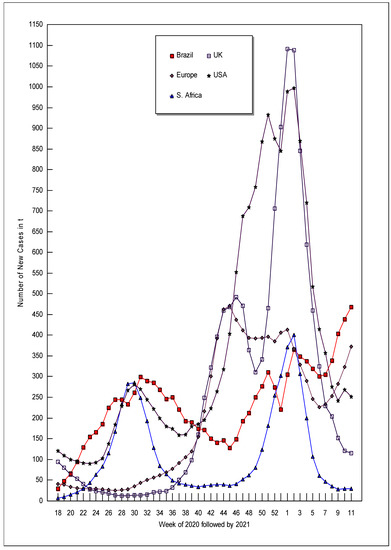 Figure 3 also shows that Europe and Brazil suffered from a resurgence of new COVID-19 cases starting the week of 7 February 2021, which could reflect their slower vaccination rates. By 30 March 2021, Europe had vaccinated only 16.43 percent of its population and Brazil had only vaccinated 8.57 percent of its population in contrast to the UK’s 50.85 percent and the USA’s 44.13. As of 30 March 2021, it appears that mutant virus strains are spreading faster than the relative slow vaccination programs of Brazil and Europe can contain them; however, the more rapid vaccination programs in the UK and the USA are reducing the spread of COVID-19 and its mutant variants. New cases in South Africa continue to fall despite South Africa having the lowest vaccination rates of the countries examined.