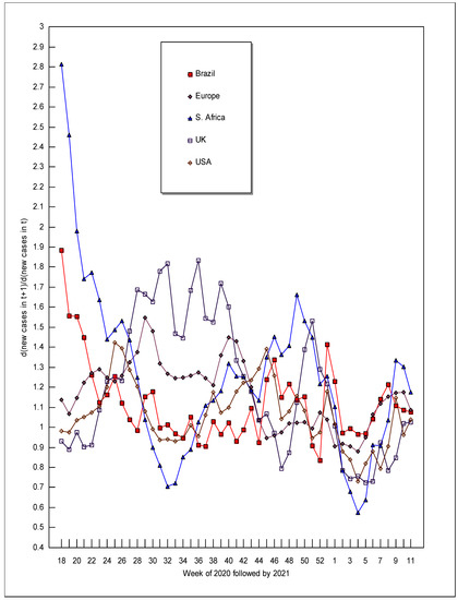 The right half of Table 2 gives the RTPLS estimates for d(new cases of COVID-19 in time t + 1)/d(new cases of COVID-19 in time t), or “dcases t + 1/dcases t” and Figure 4 plots those estimates over time. When COVID-19 first entered a country in 2020, the numerical values of dcases t + 1/dcases t were relatively high: 3.64 for Brazil (in week 14), 2.42 for Europe (week 11), 2.81 for South Africa (week 18), 5.45 for the UK (week 11), and 4.78 for the USA (week 12). The dcases t + 1/dcases t of 3.64 for Brazil in week 14 of 2020 means that an additional new case of COVID-19 in that week would have been correlated with an additional 3.64 new cases a week later (week 15). The 3.64 new cases in week 15 would then be correlated with 9.03 new cases in week 16 (3.64 times week 15′s dcases t + 1/dcases t of 2.48). This multiplicative effect causes new viruses to spread at an exponential rate (Sharma et al. 2021).