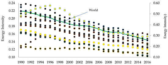 Figure 1 presents the falling trend in energy intensity across regions over more than one and a half decades. The overall energy intensity decreased by an average of 1.58% per annum from 1990 to 2016, with the highest decline of 2.75% in the BRICS countries and the lowest decline of 1.46% in the OECD countries. These diminishing trends in energy intensity show that energy consumption has declined relative to per-capita production levels—potentially, this may lower the adverse environmental impacts of energy use and production costs, hence achieving sustainability. According to the International Energy Agency (IEA), although the global energy consumption has declined by 12 percent, the energy efficiency has increased by 13%. Along similar lines, Rühl et al. (2012) have discovered that aspects including economic systems, resource endowments, and technology have supported the lowering of energy intensity through supplementing conversions and end-use efficiency. This can be inferred as an unconventional revolution in terms of humans’ environmental impacts.