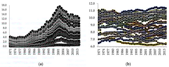 The energy–growth nexus is complex in many dimensions of the relationship. Although we observed that the income per capita has increased for all countries, Figure 3a shows that the per-capita energy consumption has increased in some countries and decreased in other countries. In particular, we observed a positive relationship between the real GDP per capita and per-capita energy consumption in countries with a relatively lower energy consumption level. On the other hand, countries with a higher energy consumption level tend to display a negative relationship between these two variables. More interestingly, we observed that the energy-intensity is falling in both groups of countries, motivating us to estimate the correct magnitude of the relationship between per-capita energy use and economic growth. Furthermore, Figure 3b depicts the contemporaneous negative relationship between the energy intensity and income per capita across all countries. However, the direction of the contemporaneous (long-run) relationship is not apparent from these descriptive measures. This postulates the basis of our further analysis on the energy-growth nexus through the lens of long-run analysis and the variety of the short-run analyses.