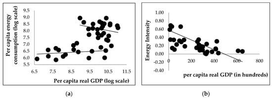 (a) Real GDP per capita and energy consumption per capita; (b) income and energy intensity (period averages for 1970–2016).