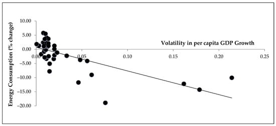 The uncertainty (volatility) in income growth was computed through the EGARCH model for all countries. Figure 4 depicts the relationship between income growth volatility and the growth in energy consumption. We observed that the uncertainty in income growth (higher volatility) reduces the energy consumption. All of the above provide important insights into the energy-growth nexus, which is further explored in the following sections.