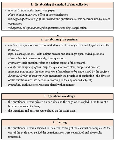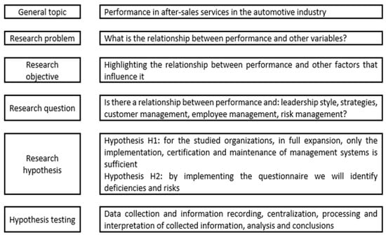 In order to achieve the proposed goal, i.e., the identification of critical factors that affect business performance, several steps were completed (Jiang and Prabhu 2008; Mitreva et al. 2019). The specific steps were as follows: establishing the general topic, defining the research problem, setting the research objective, elaborating the question to be answered by the study, formulating the research hypotheses and testing the hypotheses, as shown in Figure 1.