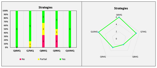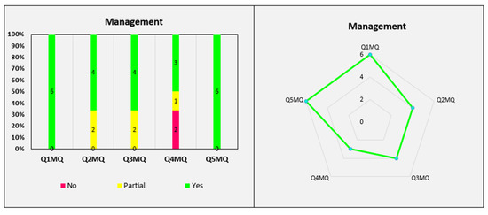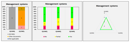 The category of management systems criteria results is presented in Figure 11. The fulfillment percentage of the category was 55.6%. The answers to questions Q14MQ and Q15MQ were noted, where 16.7% of managers stated that there was no integrated approach to the improvement of the mechanisms in place, nor did they provide assurances that the integrity of the SMI would be maintained in the event of change. A percentage higher than 27.8% stated that they partially implemented the Q13MQ, Q14MQ and Q15MQ criteria.