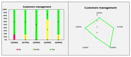 The customer management criteria results are presented in Figure 12. The fulfillment percentage was 76.7%. The answers to the Q16MQ question were noted, where 3.3% of managers claimed that the organization did not develop and maintain long-term partnerships with customers, while a further 20% of managers stated that they partially implemented the Q19MQ and Q20MQ criteria.