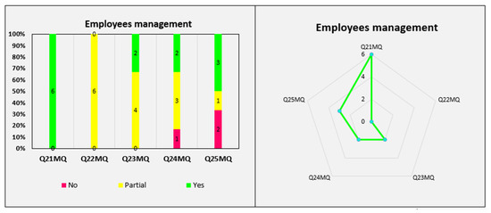 The employee management criteria results are presented in Figure 13. A very important aspect in the analysis of employees’ responses shows a percentage of fulfillment of the category of only 43.3%. Most of the managers, namely 46.7%, stated that they partially implemented the following criteria: setting and evaluating the individual objectives for each employee (Q22MQ); identifying, analyzing and establishing the needs for improving the professional training of employees in order to perform their duties (Q23MQ); carrying out professional development programs (Q24MQ) and establishing indicators for measuring customer satisfaction (Q25MQ).