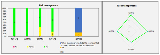 The risk management criteria results are presented in Figure 14. The fulfillment percentage of the category among the studied organizations was 87.5%. A further 12.5% of managers claimed that the relevance of the indicators associated with the objectives was partially re-evaluated. A very important aspect in the analysis of the answers was that, in only 16.7% of the organizations, the specific objectives were re-evaluated periodically.