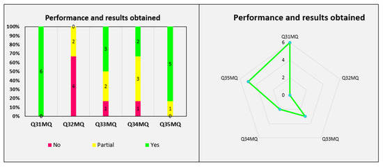 The performance and results obtained are shown in Figure 15. The fulfillment percentage was 53.3%. Less than 26.6% stated that they partially implemented the following criteria: integration and acceptance of ethnic minorities and disadvantaged people (Q32MQ); development of risk/accident prevention programs for the health of customers/employees (Q33MQ); improving the reputation and image among citizens (Q34MQ) and obtaining results correlated with the set objectives (Q35MQ). A very important aspect for this category was the fact that 20% of organizations did not implement the criteria included in this category.