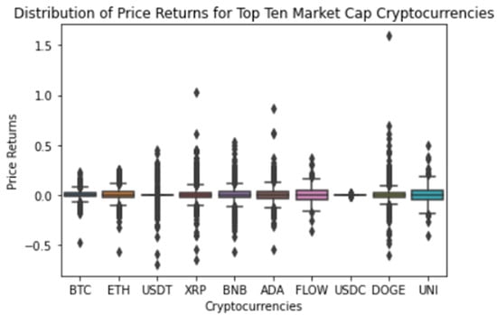 Figure 1 visualizes the boxplot of price log returns for each of the cryptocurrencies. The value for USDC seems to be around zero because USDC is a stable cryptocurrency, whereas the values of price log returns for XRP, BNB, USDT, ADA, and DOGE are more scattered around the zero because most of the Altcoins have a high volatility. The values of price log returns for BTC, ETH, and FLOW are less volatile than those of XRP and DOGE in Table 1.