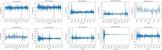 Time-series plot of price log returns of 10 cryptocurrencies.