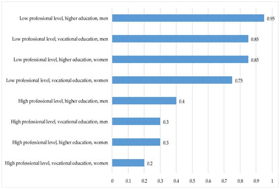 Thus, from the modeling results it can be generally concluded that the unemployed men with complete higher education looking for a job in a group of middle or low level professions have the highest chance of not working in their specialty; unemployed women with incomplete (basic) higher education or vocational education looking for a job in a high level profession group have the lowest chance of not working in their specialty.