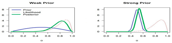 The frequentist approach to statistics treats parameters as fixed but unknown quantities, where we can estimate these parameters using a sample from the population. However, different samples will yield different estimates. The distribution of these estimates is known as a sampling distribution and quantifies the uncertainty about the estimates even though the parameter itself is considered fixed. The Bayesian approach is a different way of thinking. Our parameters are treated as random variables that can be described with a probability distribution (Giannone et al. 2015). Probability is our degree of belief, absent data. This mathematical expression of our belief about the parameters included is called the prior distribution. Furthermore, we can investigate the effect of the prior distribution by conducting an experiment based on the likelihood function to produce another distribution, known as the posterior distribution. Bayesian inference allows the researcher to update his prior beliefs about the parameter with the results obtained from the experiment. In other words, we can compute the posterior distribution by multiplying the prior with the likelihood. Additionally, if the posterior belongs to the same family as the prior, the prior is called conjugate. The posterior can closely resemble the prior when the sample size is small and the prior is informative. In contrast, the posterior will be closer to the likelihood as we increase sample size or use an uninformative prior, such as a flat prior; see Figure 1.