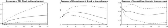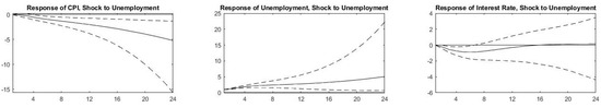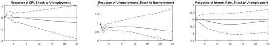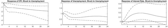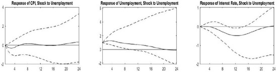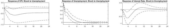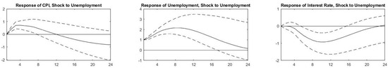 The rapid spread of COVID-19 and its identification as a pandemic introduced a shock to economic activity. Lockdowns were implemented in 2020 Q2 following the spread of the virus in different countries where industrial and business activity declined, and unemployment rates increased drastically. As a result, authorities took measures to counter the decline in economic activity and embarked on fiscal and monetary expansion as of 2020 Q3. The impulse response functions (IRFs) for the nine countries that we present in Figure 2, Figure 3, Figure 4, Figure 5, Figure 6, Figure 7, Figure 8, Figure 9 and Figure 10 allow us to witness the natural response of our variables to the exogenous shock in the absence of such expansionary government measures.