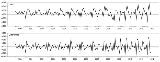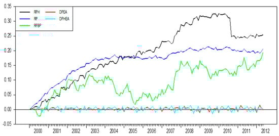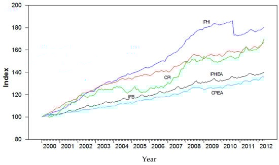 In addition, in Figure 4, Figure 5, Figure 6, Figure 7 and Figure 8, empirical time-series data in the sample have a linear trend, which describes that time-series are moving in a linear combination. Table 1 shows the properties of the time-series data used in a general VAR model. The number of observations for each of the variables is 149. The mean value is the smallest for the and the highest for the (January 2000 = 100). The variable of the has a maximum value of 138.35. The distribution of price indices indicates the characteristics of the time-series data and the distribution of indices in terms of level, which are not similar to a normal distribution.