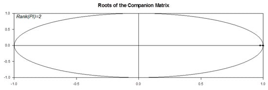 The testing hypotheses focus on hospitality industry prices in a cointegration relationship using seasonally unadjusted variables from the Statistical Office of the Republic of Slovenia (SURS) (https://pxweb.stat.si/sistat, accessed on 18 October 2021) and Eurostat (https://ec.europa.eu/eurostat/en/web/main/data/database, accessed on 18 October 2021). Figure 1 illustrates the increase in all empirical price indices in levels over the period starting in January 2000. The period from January 2000 to May 2012 includes cyclicity, both in terms of expansion and crisis. Time-series indices are for the consumer price index () and other price indices used in time-series data analysis: the Slovenian food and beverages price index (), the Slovenian price index in the hospitality industry (), the Eurozone price index in the hospitality industry (), and the consumer price index in the Eurozone (). The constant base period indices are with January 2000 = 100. The stationary characteristics of the model to define roots need an apparent assumption of log-linearisation. The largest constant steady-states of the model were 1.000 and the lowest one 0.976. A root of 1.000 is in application identical to a unit root. Therefore, a root of 0.976 is nearly unity as a good source of persistency in the data (Figure 2). In addition, the tests for the data properties of each variable are presented in Appendix C (Table A3, Table A4 and Table A5), while necessary misspecification tests are presented in Table 1.