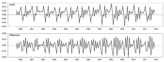 It is easier to understand an expected range of values that lies outside the mean in the than in the , and the visual test presented in Figure 9, Figure 10, Figure 11, Figure 12 and Figure 13 is performed. Additionally, the inspection of the results on the unrestricted VAR(2) model for the data showed high in months January 2002 (), September 2007 (), and November 2007 (), which is caused by the significant monthly increases. The first tentative conclusion for the unrestricted model VAR(2) is a policy shift, for example, with a permanent or impulse dummy (differentiated variable) that can be generated by generating the differentiated process. Almost all policy changes in our model are permanent. This is true not only for high food price indices but also for the seasonal declines in the in September 2001 (), October 2004 (), and in September 2010 (). This can be linked to the attacks of 11 September 2001 and Slovenia’s accession to the EU in 2004. In the last quarter of 2010, the fell rapidly by 13.02% on a monthly basis. is a mean shift dummy or blip (in differences) variable. Our last permanent dummy was in December 2006 () on the month before Slovenia adopted the euro. Testing the normality of structural breaks (dummies) included in Equation (11) are presented at the bottom part of Table 2.