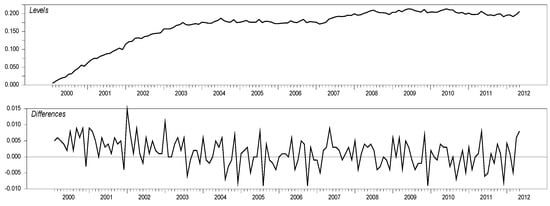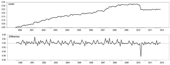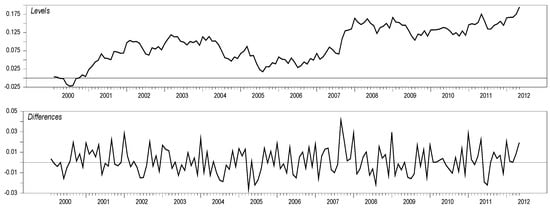 Note that implies , meaning long-term price homogeneity or cointegration among price indices. In this case, the stochastic trend in price indices can equally be measured by the stochastic trend in the growth of prices (Juselius 2009). Differenced variables of time-series ( and ) looks very similar from a stochastic point of view. On this basis, it is assumed that three variables of price indices are in a convenient way to transform nominal price index data vector into real price index vector as described in Equations (1)–(3). This data set is used in the empirical analysis to illustrate research and policy-relevant empirical results. The data vector of real price indices can be rewritten as: