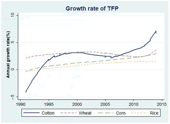 The TFP growth trend of cotton is different from the other three grains.
