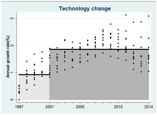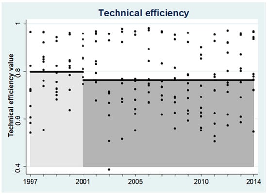The values of TE before and after Bt technology adoption are shown in Figure 3. Even though it is difficult to be certain from the scatter plot, it seems that the TE shows a decreasing trend over time. Figure 3 appears to show that the TE of non-Bt cotton is higher than that of Bt. To further show the difference, we then calculated the average values of the TE of non-Bt technology (i.e., 1997–2001), and the TE of Bt technology (i.e., 2002–2014). As shown in Figure 4 (bars), the average value of TE for 1997–2001 is higher than that for 2002–2014.