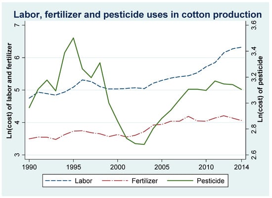 Fertilizer, pesticide and labor inputs of cotton over time.