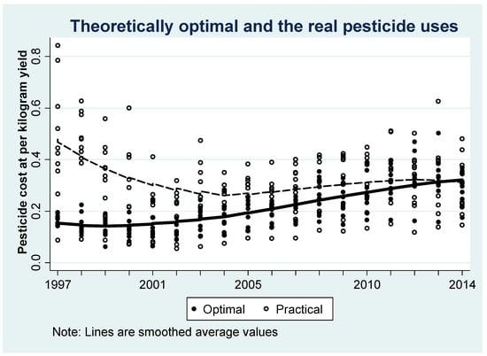 As the main advantage of the new technology (i.e., Bt technology) is reduced pesticide use, in the following section we will check whether a learning process exists by showing the dynamics of pesticide use after the introduction of Bt cotton. Specifically, we show both the theoretical optimal level of pesticide use and the level that farmers spray in practice. We then use the difference between these two levels as an index for technical efficiency. A high difference means a low technical efficiency, while a low difference means high technical efficiency. In addition, if a decreasing differences trend (i.e., an increasing TE trend) is shown after Bt cotton was commercialized, we can conclude that a learning process occurs.