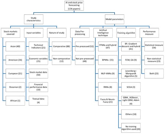 The above auto-coded themes are categorized into study characteristics and model characteristics. Study characteristics are further categorized as the stock market covered, input data, and nature of the study. Model characteristics are classified as data pre-processing, artificial intelligence technique, training algorithm, and performance measure. Study characteristics give a glimpse of the stock markets covered, the type of input variables used, and whether or not the author has undertaken a comparative analysis of different AI techniques. Model characteristics detail the forecasting methodology used in the extant literature, including data pre-processing, artificial intelligence techniques employed, training algorithm applied, and performance measures (statistical or non-statistical) used to compare the performance of different models.