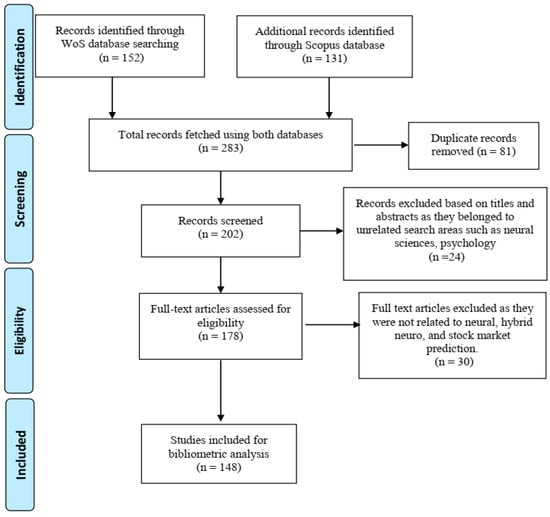 This query yielded us 283 papers (152 from WoS; 131 from Scopus) initially, which were filtered for duplicates, leaving us with 202 records. These records were screened twice, leading to the elimination of 24 articles in the first screening process based on titles and abstracts only, as they belonged to different research areas, such as neural sciences, psychology, etc. Further, in the second screening process, 30 more articles were rejected (as they were not related to neural, hybrid-neuro, and stock market prediction), this time by thoroughly analyzing the full text of 178 papers, as they did not focus on applying artificial intelligence technique to forecast stock markets. This task left us with 148 articles in total, as presented in the PRISMA diagram () in Figure 2.