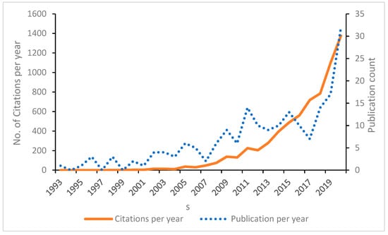 Figure 3 summarizes the year-by-year publications and citations of papers relevant to the study’s subject. The research in applying AI techniques in stock market forecasting has significantly increased after 2008, representing a clear increasing trend in the related topic. This could be due to the global economic crisis of 2008 (), which made stock markets highly volatile, hence, attracting the widespread interest of research scholars and academicians in the discussed topic. The highest citation record is seen in the year 2020, with a 1377 citation record count.