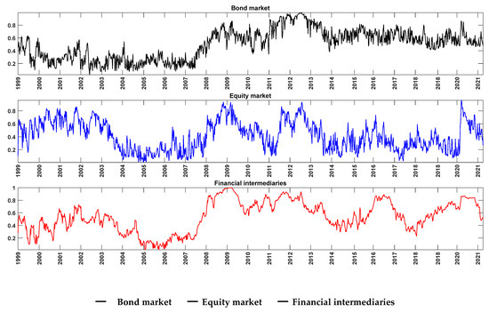 Panel A of Table 2 presents the descriptive statistics for the series, along with the Jarque–Bera test for normality. The mean ranks between 0.4170 (equity market) and 0.5416 (financial intermediaries). The estimated skewness is negative for financial intermediaries (suggesting that the distribution has a long-left tail), while it is positive for the remaining market segments (indicating that the distribution has a long-right tail). The excess kurtosis is negative in all cases, suggesting that the distribution of the series is flat relative to normal. This asymmetry and platykurtic excess are in line with the Jarque–Bera test results, justifying the rejection of the hypothesis of normal distribution at the 1% significance level. We report the pairwise correlations in panel B of Table 2. All pairwise correlations are positive and highly significant, except for the negative and insignificant correlation between the stress indicators of the bond market and money market segments, suggesting a certain degree of co-movement between these stress indicators of different market segments.