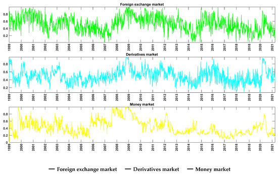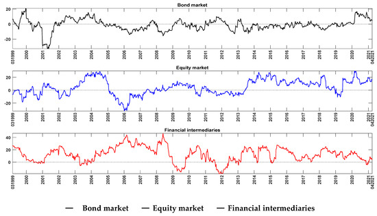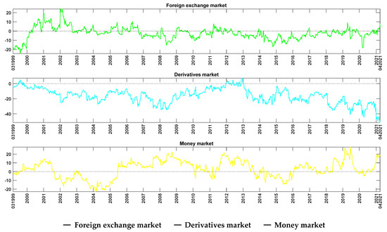 As shown in Figure 4, most of the stress indices under investigation appear to frequently switch between assuming a net transmitting and a net receiving role of financial stress, except for the index representing the derivatives market (light blue line), which is a recipient of stress throughout 96.10% of the sample (with its estimated average value for net directional connectedness being −16.24%). This result suggests that the derivatives market is not a trigger of stress to the system, as is usually suggested in the financial press (Warren Buffet called derivatives markets “financial weapons of mass destruction”), but rather a receiver of stress from underlying markets. Thus, these net directional connectedness relationships are bidirectional and asymmetric across five of the six stress indices. Moreover, our results suggest that the foreign exchange market (green line) and the bond market (black line) are net absorbers of financial stress throughout the sample (showing negative values for 68.60% and 57.85% of the sample, respectively, and with average values of −2.33% and −1.13%, respectively), while the financial intermediaries (red line), the money market (yellow line), and the equity market (dark blue line) are net stress propagators during most of the sample (rending positive values for 86.38%, 63.40%, and 61.06% of the sample, respectively, with average values of 12.52%, 2.80%, and 4.39%, respectively).