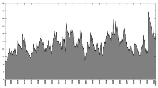 These indicators are provided weekly by the CNMV and are based on the information received from relevant financial intermediaries, comprising 18 market-based financial stress variables representing changes in volatility, credit spreads, liquidity, and loss of value in different instruments. To the best of our knowledge, no such detailed datasets are available for other European countries to date. As mentioned before, the CNMV also provides the FMSI as a global measure of systemic risk in the Spanish financial system. The stress indicator indices range from 0 (tranquil or low stress period) to 1 (turbulent or high stress period). Our sample spans from 1 January 1999 to 2 April 2021 (i.e., a total of 1162 weekly observations), and it includes several remarkable episodes of the Spanish economy, which we enumerate below.