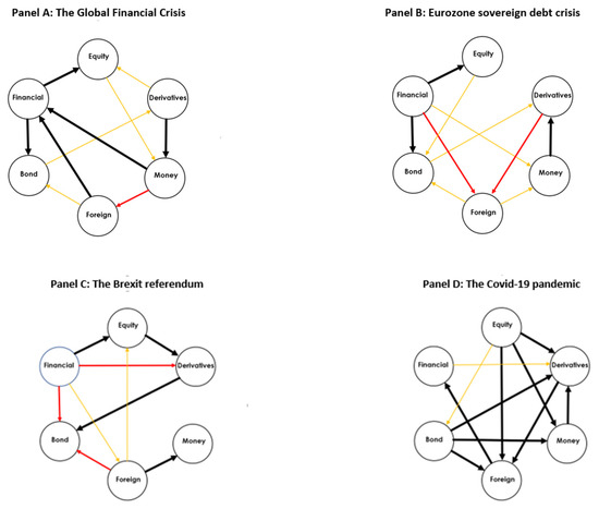 Network diagram of pairwise net directional stress spillovers on certain critical episodes. Note: We show the most important net directional connections among the six market stress indices under study for four critical episodes. Panel (A) illustrates the period of the global financial crisis (August 2007 to October 2008), panel (B) shows the Eurozone sovereign debt crisis (April 2010 to August 2011), panel (C) shows the global financial turmoil following the Brexit referendum (June to October 2016), and panel (D) shows the outbreak of the COVID-19 pandemic (March to June 2020). Black, red, and orange links (black, grey, and light grey when viewed in greyscale) correspond respectively to the 90th, 80th, and 70th percentiles of all net pairwise directional connections.
