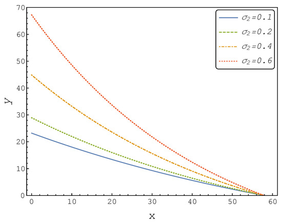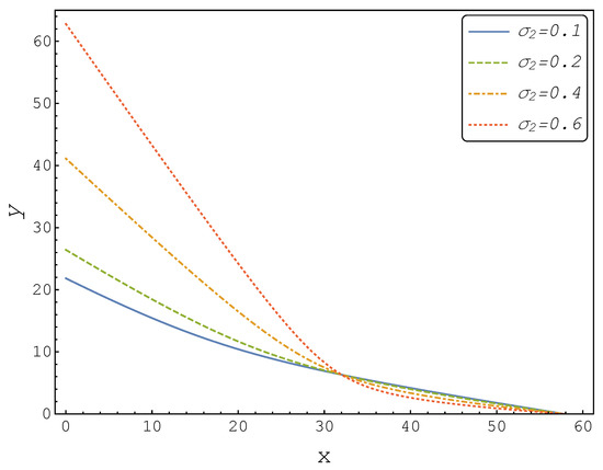 In the following, we studied the behaviour of the investment boundary as a function of the volatilities of the involved processes, and . Thus, we let denote the boundary, given that the current price of the first product was x, and that the volatilities were (for X) and (for Y).