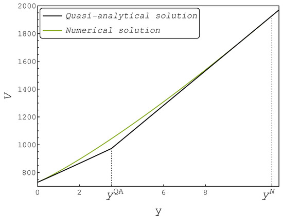 In addition, finite difference also allowed for the calculation of an approximation to the value function that was implied by the quasi-analytical boundary . This could be performed by solving (37) for the boundary in (23). Figure 3 illustrates the comparison between the implied value function and the numerical solution represented by the quadratic boundary for a fixed level of x and different values of y.