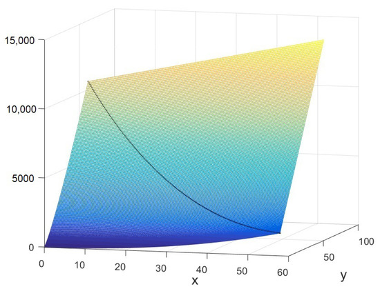 From Figure 3, it is evident that the value function implied by the quasi-analytical solution had a kink at the boundary point , violating the smooth-pasting condition. Consequently, the quasi-analytical approach underestimated the true value function, which led to a sub-optimal investment decision rule for large values of x. Note that the quasi-analytical approach suggested a much lower trigger than our finite difference scheme. For , the numerical procedure based on the finite difference algorithm gave the boundary point , such that the smooth-pasting condition held. Figure 4 illustrates the value function for different values of x and y, as well as the threshold boundary.