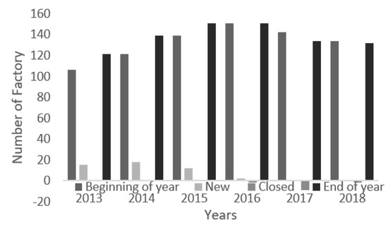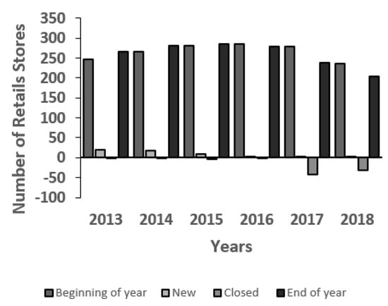 The number of J. Crew factories were 121 at the end of 2013, which increased to 139 (a rise of 14.88% from the previous year) by the end of 2014, with an addition of 18 new factories. In the year 2015, this corporation recorded the final number at 151 by continuing the increasing trend with 8.63% of increase over the previous year. Whereas, 2016 was a standstill without any news additions or closures of factory outlets. Subsequently, the years 2017 and 2018 documented a drop in the stores with nine and two closures, respectively (Table 1 and Figure 2).