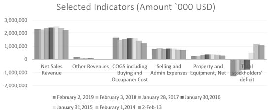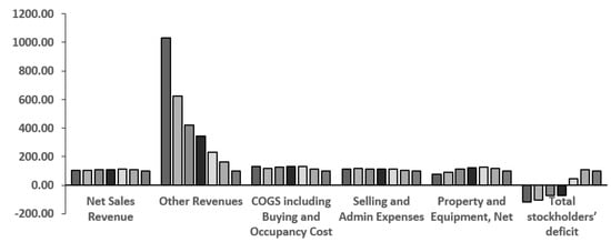 Taking 2013 as a base year, J. Crew’s net sales revenue, which was the primary source of income, increased by 8.57% in 2013–2014, 14.92% in 2014–2015, 10.72% in 2015–2016, 6.75% in 2016–2017, 2.58% in 2017–2018, and 4.43% in 2018–2019. The increase in net sales revenue was quite insignificant during the given period. J. Crew’s other revenues galloped at an extremely higher rate of 64.71% in 2013–2014, 130.86% in 2014–2015, 241.97.72% in 2015–2016, 321.09% in 2016–2017, 522.85% in 2017–2018, and 931.17% in 2018–2019. However, the company’s deteriorating financial condition proves that this source of income constituted only a minor component of total income (Table 6 Panel B and Figure 5 and Figure 6).