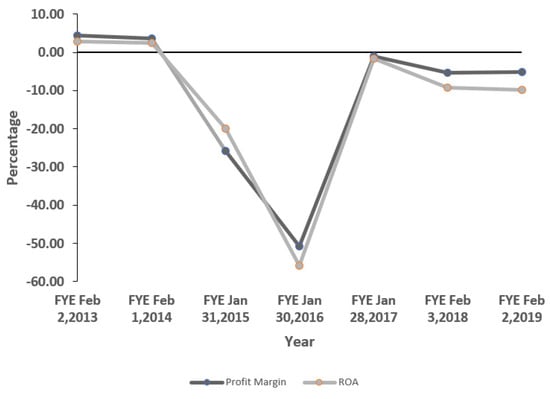 J. Crew’s profit margin ratio was significantly low during 2012–2013 and 2013–2014, at 4.31% and 3.63%, respectively. Then, from 2014–2015 onwards, the company started generating negative returns as follows: net loss of 25.89% during 2014–2015, net loss of 50.77% during 2015–2016, net loss of 1.01% during 2016–2017, net loss of 5.43% during 2017–2018, and net loss of 5.20% during 2018–2019. However, J. Crew’s return on investment was significantly low during 2012–2013 and 2013–2014, which were 2.76% and 2.46%, respectively. However, from 2014–2015 onwards, the company started getting negative returns as follows: −19.89% during 2014–2015, −55.87% during 2015–2016, −1.60% during 2016–2017, 9.31% during 2017–2018, and −9.89% during 2018–2019 (Figure 7).