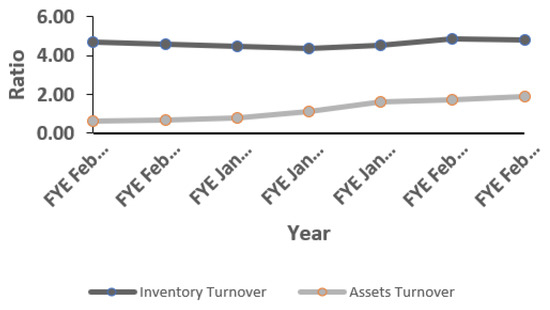 J. Crew’s inventory turnover was 4.67 times during 2012–2013, 4.59 times during 2013–2014, 4.46 times during 2014–2015, 4.35 times during 2015–2016, 4.51 times during 2016–2017, 4.86 time during 2017–2018, and 4.83 times during 2018–2019. This ratio never entered negative but the values were significantly low. This ratio also indicates that the company was hardly able to convert its inventory into sales less than 1.5 times for the last few years (Table 7 and Figure 8).