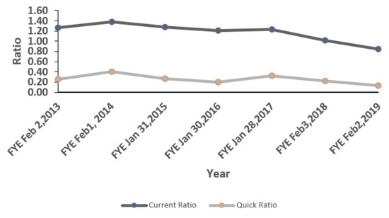 J. Crew’s current ratio throughout the period from 2013–2014 until 2018–2019 is lower than the ideal current ratio standard of 2:1. Similarly, quick ratio also never met the standard of 1:1 even once during the last five financial years. Current ratio and quick ratio are very frequently used (Sharma and Mahajan 1980). J. Crew’s measures of liquidity results depict that there is a greater gap between meeting the current debt using current assets. This was another signal which was ignored by J. Crew for more than five years.