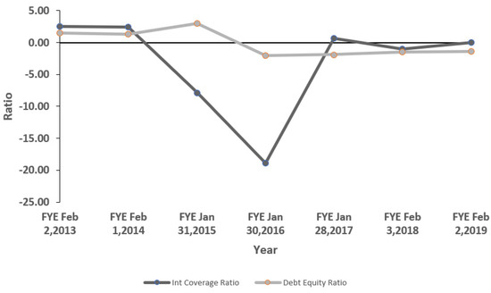 J. Crew’s interest coverage ratio was 2.49 times during 2012–2013, 2.40 times during 2013–2014, −7.87 times during 2014–2015, −18.91 times during 2015–2016, 0.62 times during 2016–2017, −1.05 times during 2017–2018, and 0.01 times during 2018–2019. This shows inadequate capacities to pay off the interest expense. J. Crew’s debt equity ratio was 1.45:1 during 2012–2013, 1.32:1 during 2013–2014, 3.01:1 during 2014–2015, −2:1 during 2015–2016, −1.91:1 during 2016–2017, −1.49:1 during 2017–2018, and −1.40:1 during 2018–2019. This shows that the company had adopted a very conservative approach (Table 9 and Figure 10).